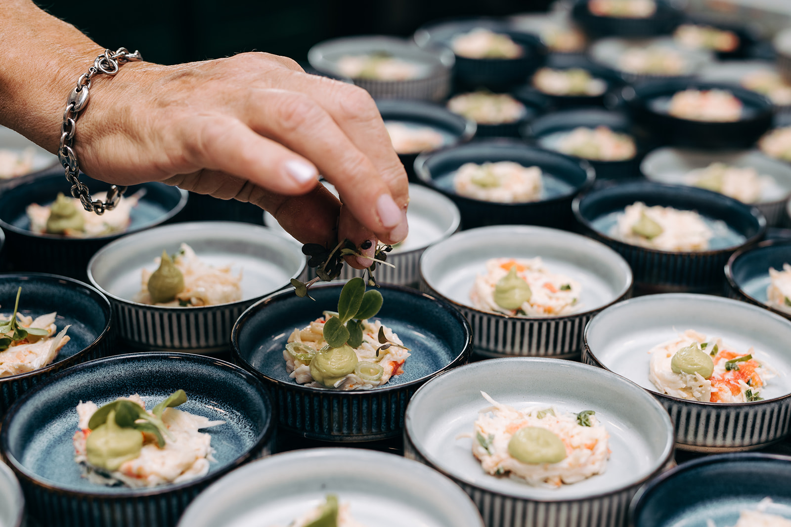 Luxe hapjes, zowel warm als koud, mooi gepresenteerd.